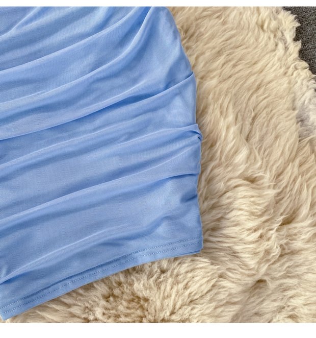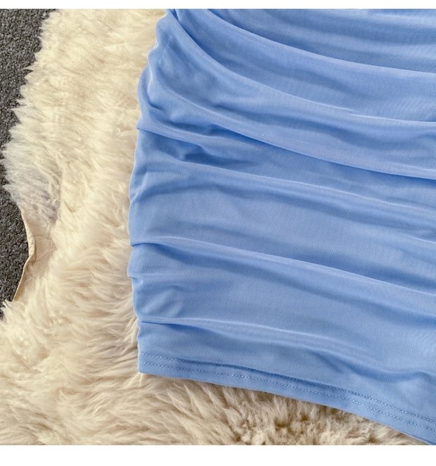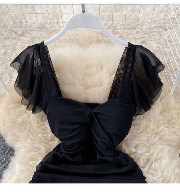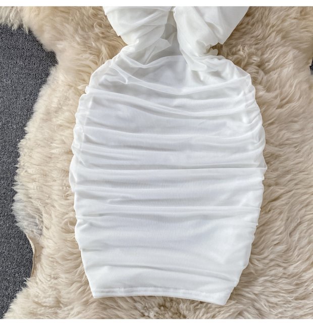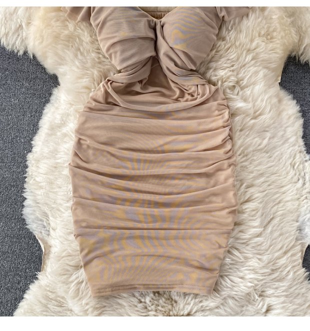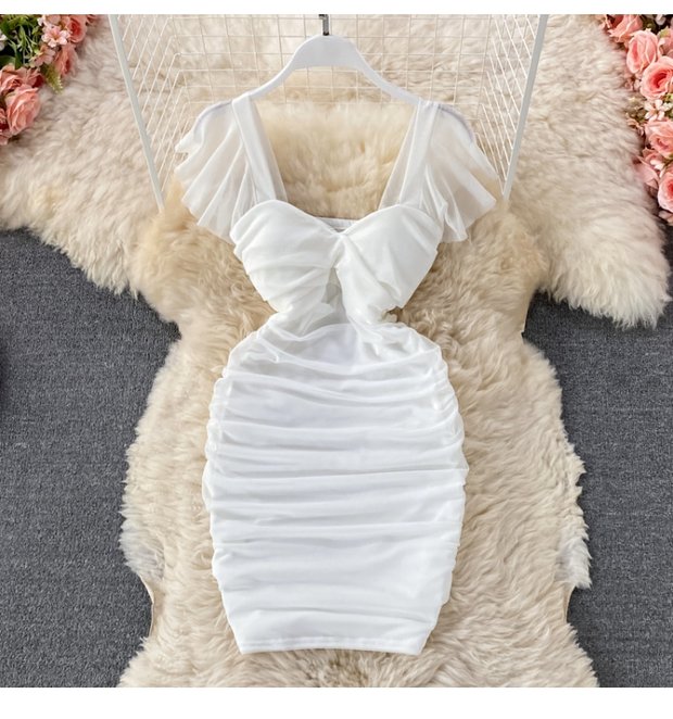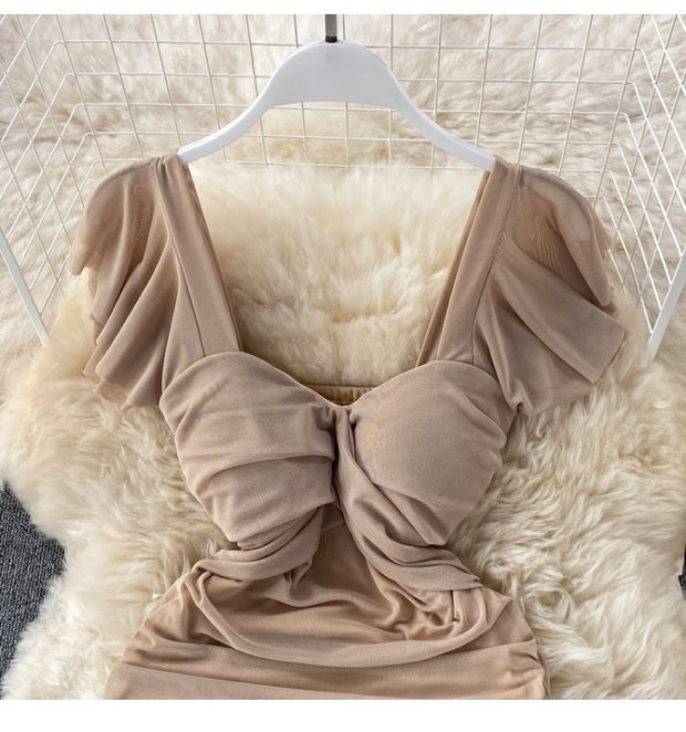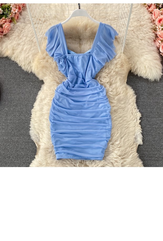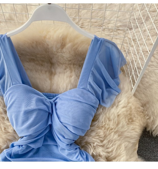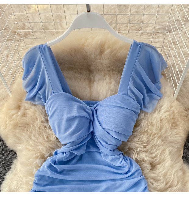 Summer New French Sexy High Waist Slimming Pleated Square Collar Sheath Dress Short Sleeve Party Dress