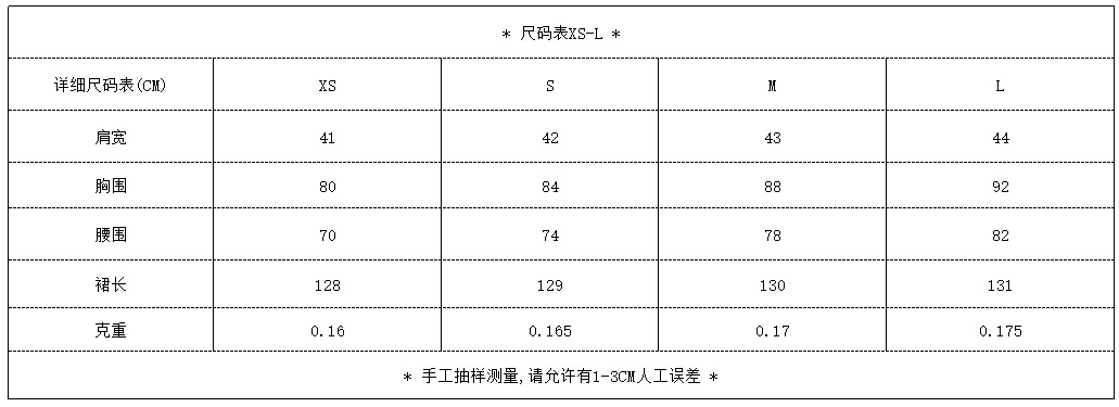 XS: Shoulder Width 41 Bust 80 Waist 70 Skirt Length 128