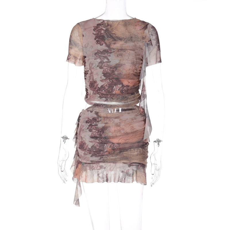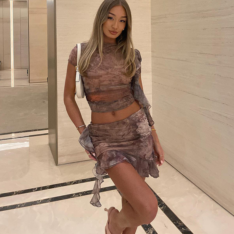 European and American Foreign Trade New Summer Women's Clothes Fashion Printing ShortTStitching Wooden Ear Short Ruffled Skirt Suit
