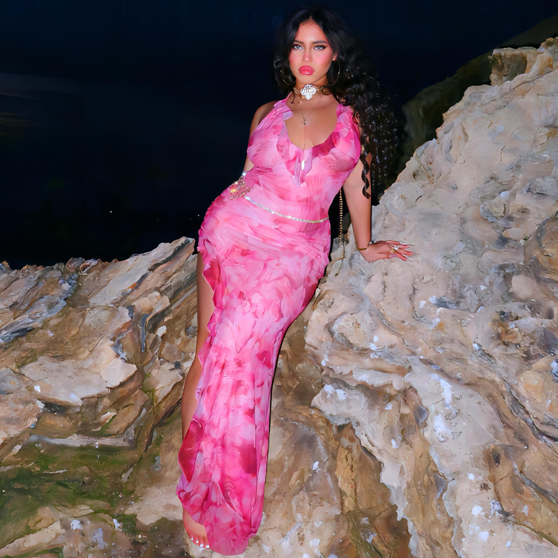 European and American Foreign Trade New Women's Printed Wear SexyVCollar Backless Halter Stitching Mesh Stringy Selvedge Dress Generation Hair