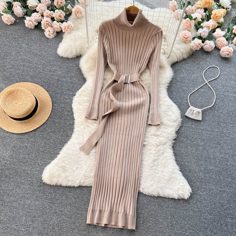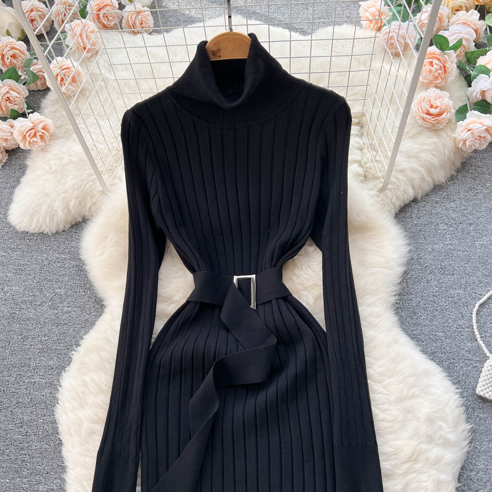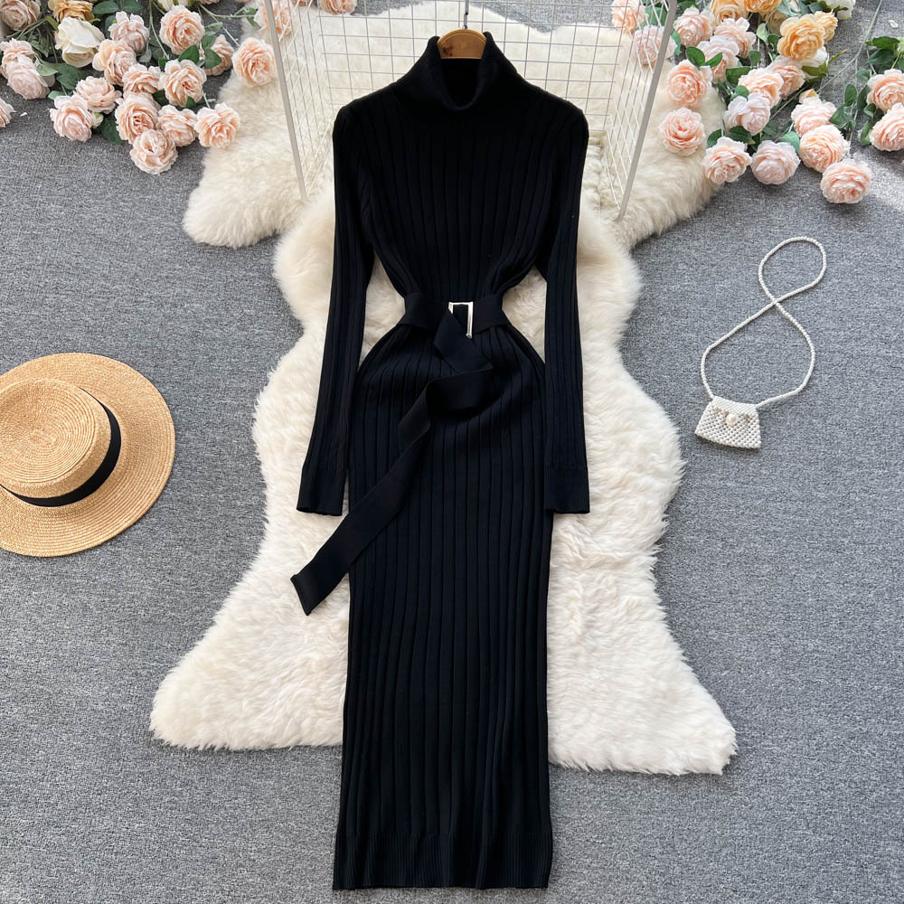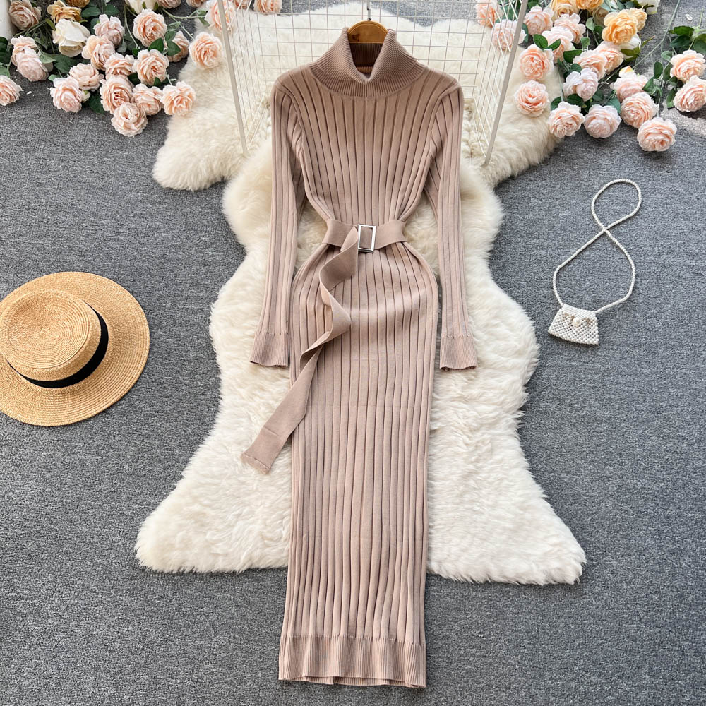European and American Style Half Turtleneck Knitted Dress Fall Women's Clothing French Retro Waist-Controlled Slim Fit Sheath Dress