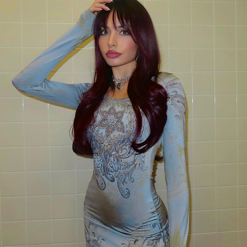 European and american women's clothing2023Autumn New Fashion Beautiful Printing Shiny Rhinestone Long Sleeve Narrow Dress for Women Wholesale