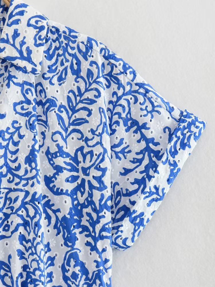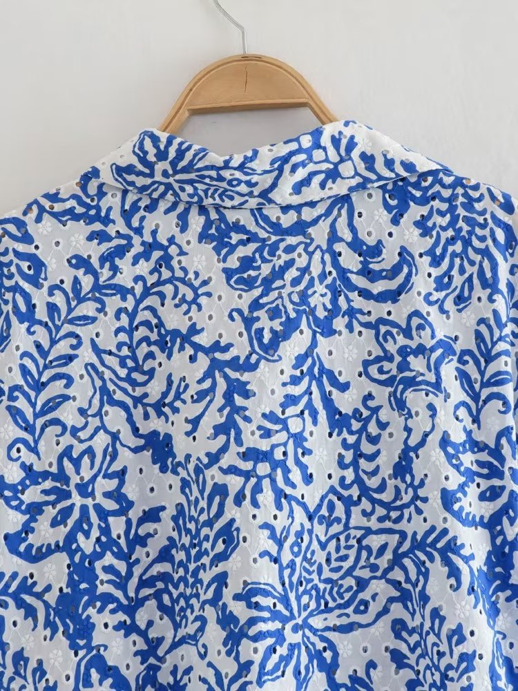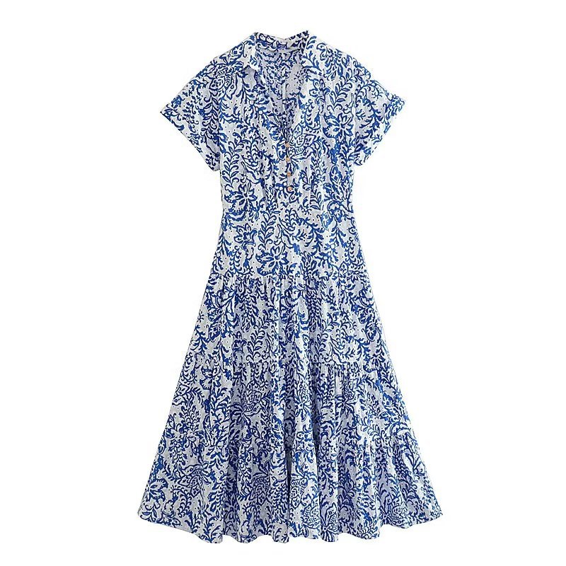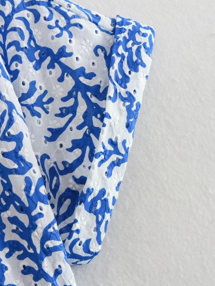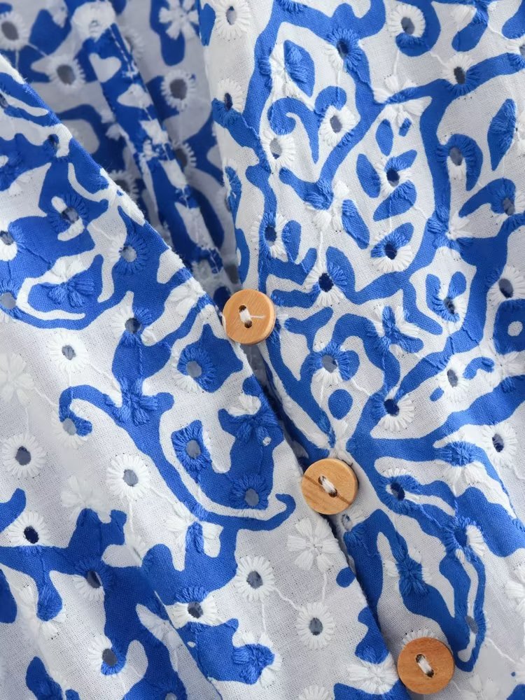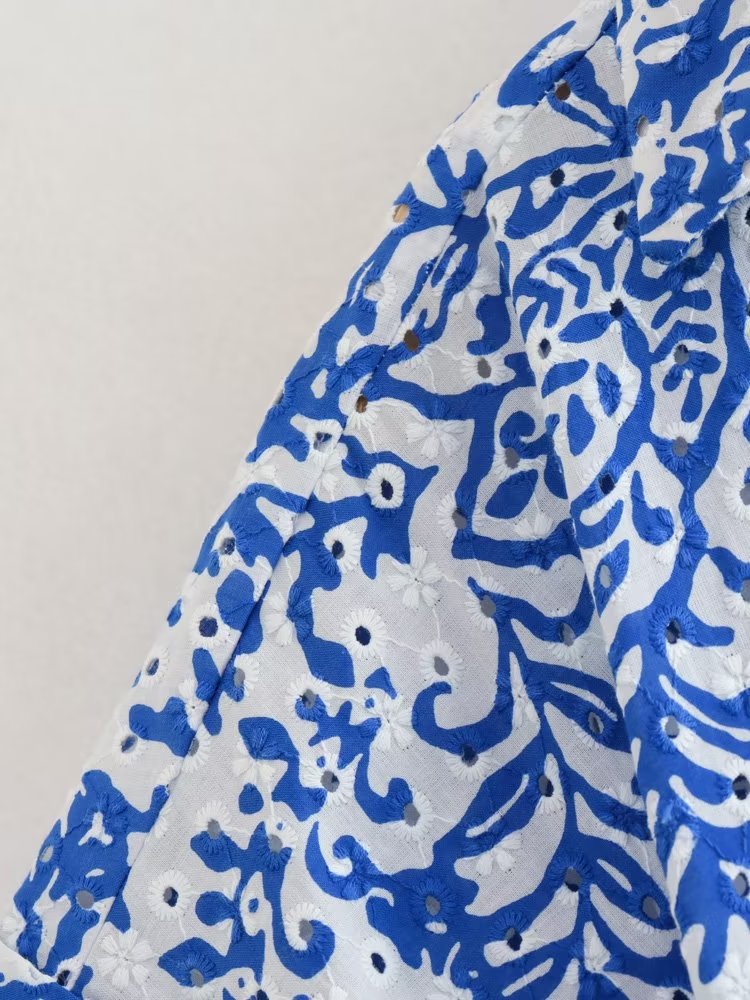 Factory Foreign Trade Wholesale2023European and American Summer Wind Women's New Hollow Embroidered High WaistVWomen's Midi Skirt Collar Dress