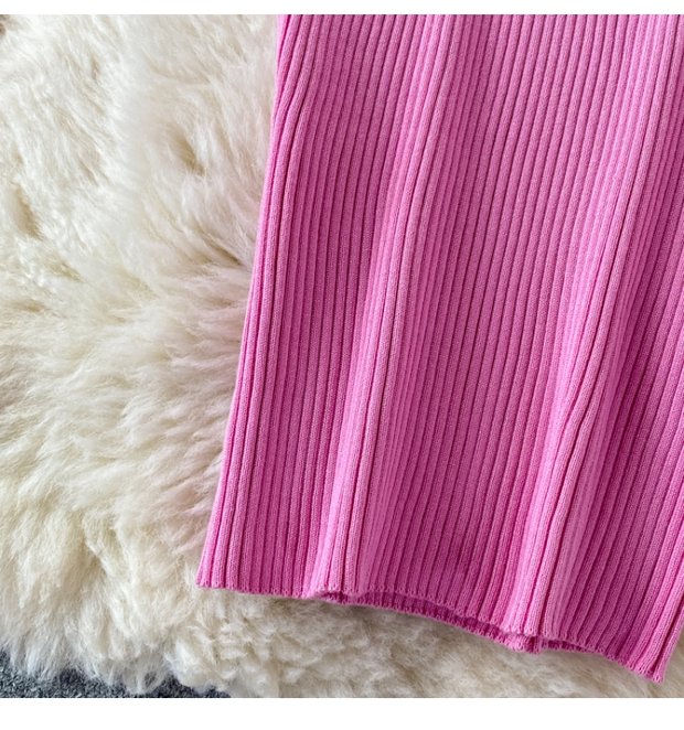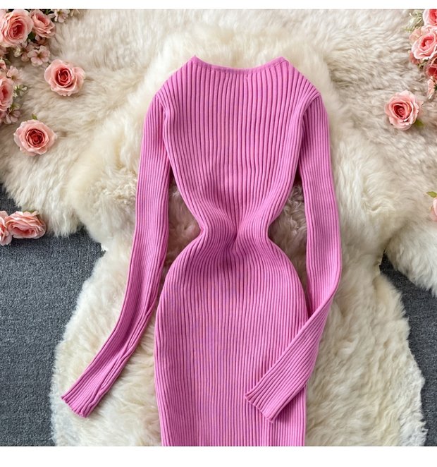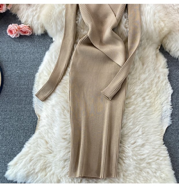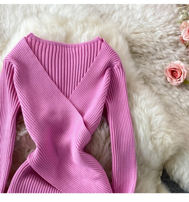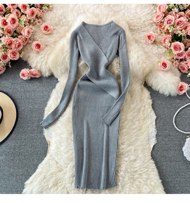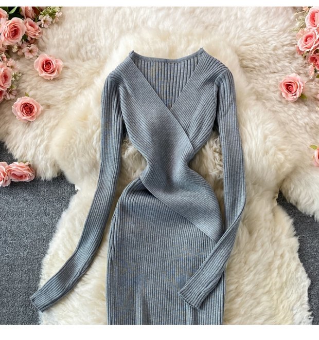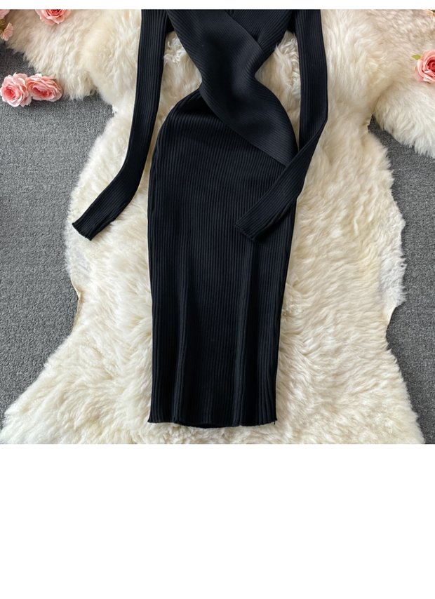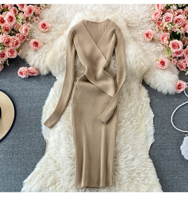 French Retro Sexy DeepVCollar Knitted Dress2021Autumn Waist Slimming Temperament Hepburn Midi Dress