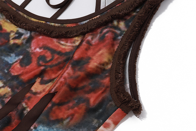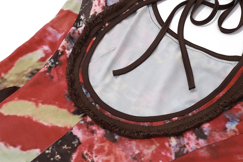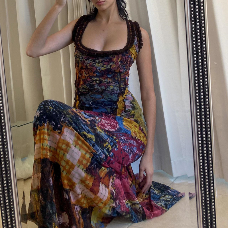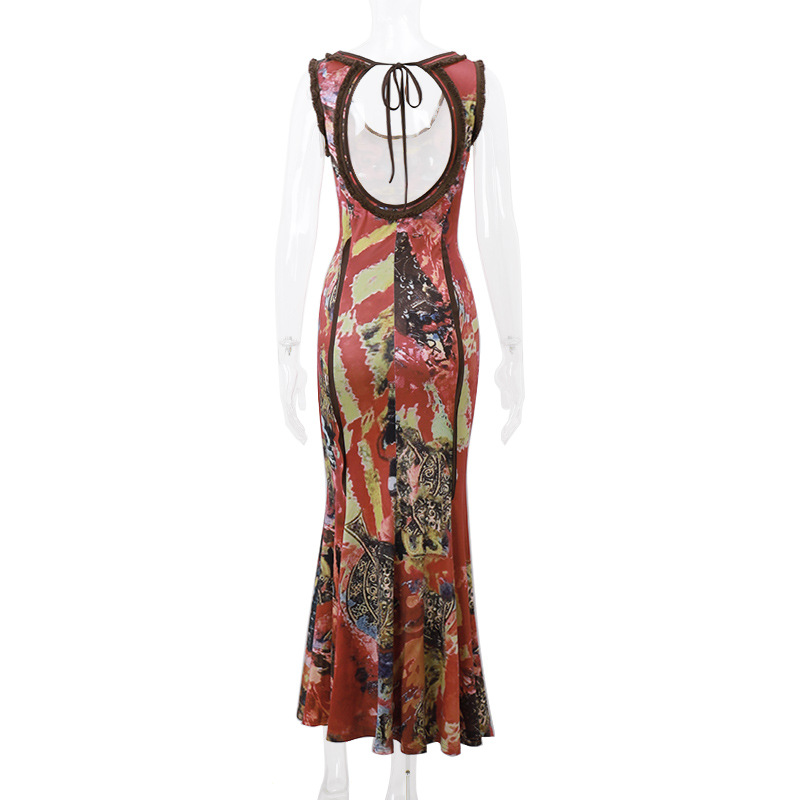 insEuropean and american women's clothing2023Summer New Fashion Retro Tie-Dye Printed SexyUCollar Slim Dress Long Dress
