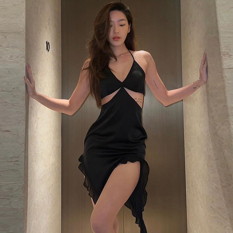 YJ23009European and American Spring and Summer New Three-Dimensional Floral Ruffled Spaghetti Straps Hollow Slim Sexy Hot Girl Dress