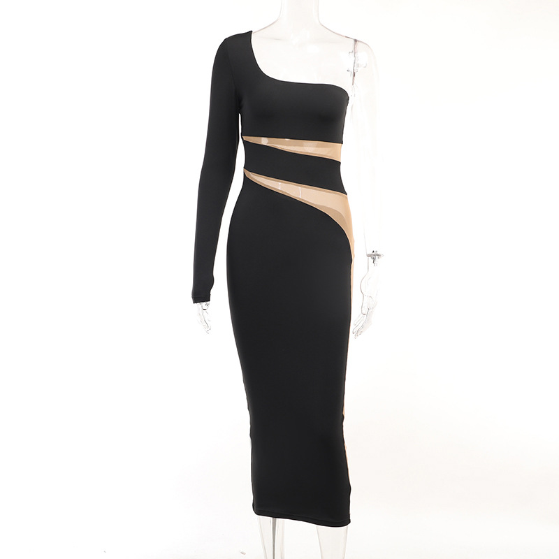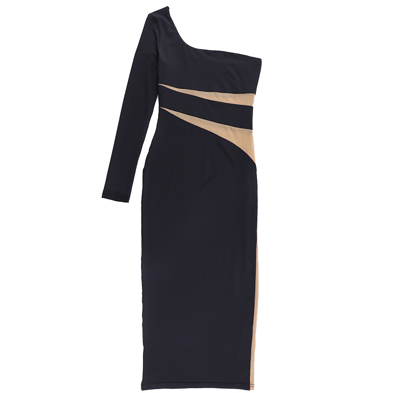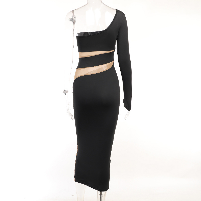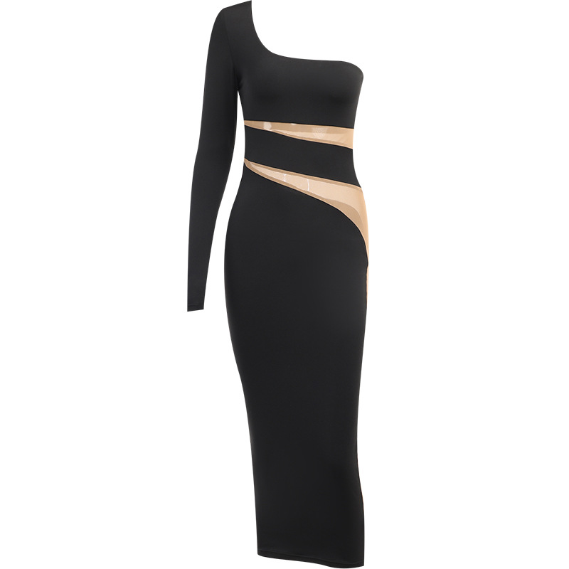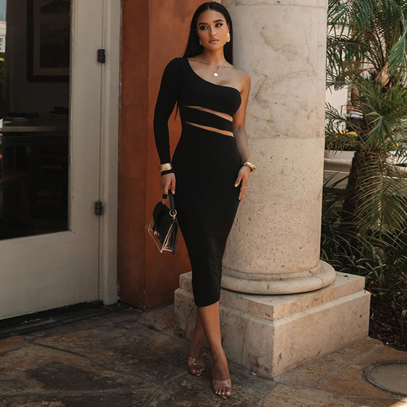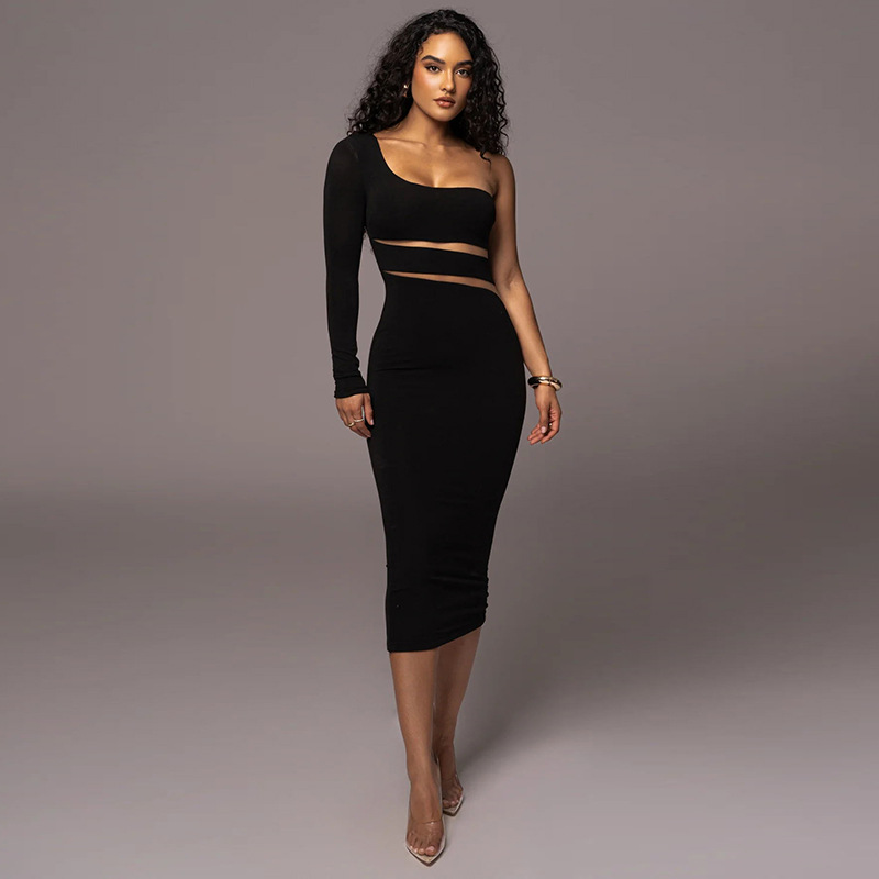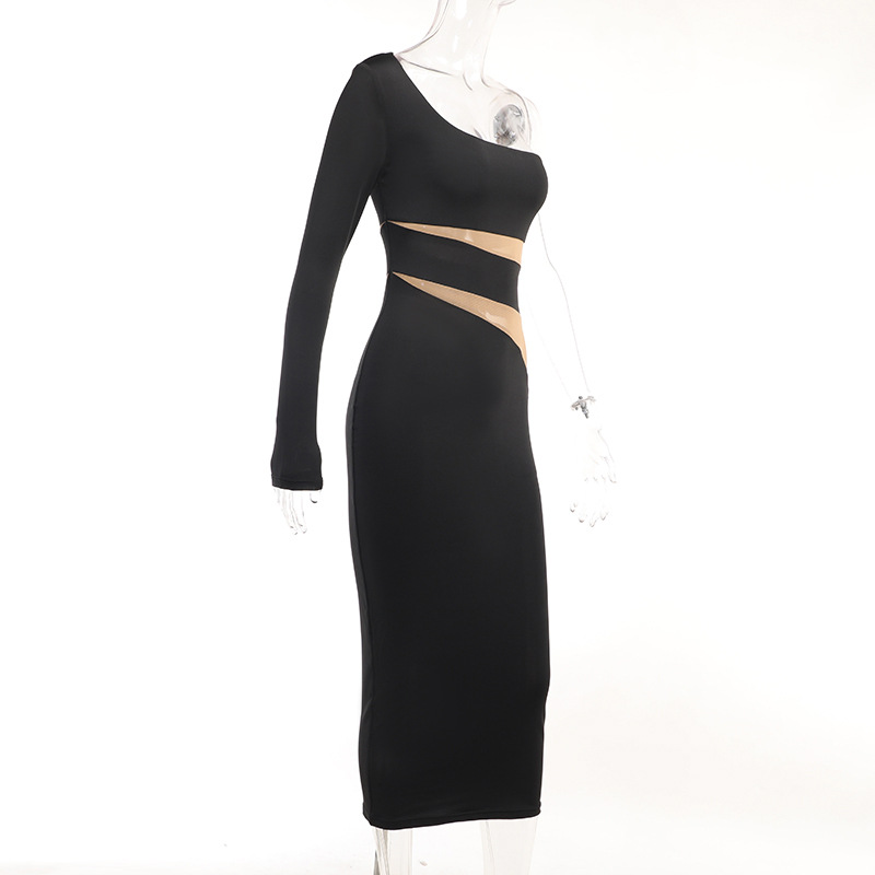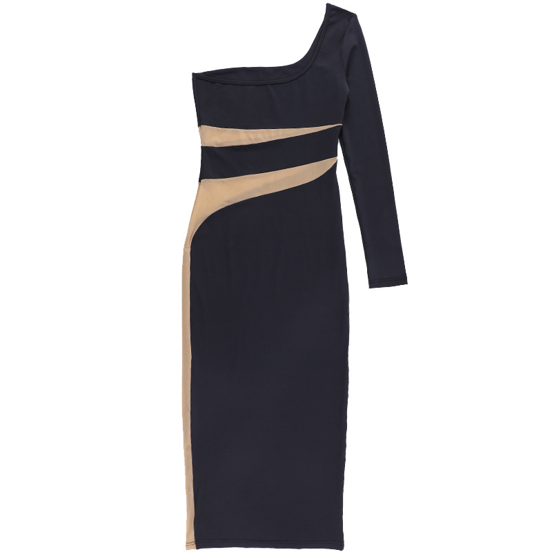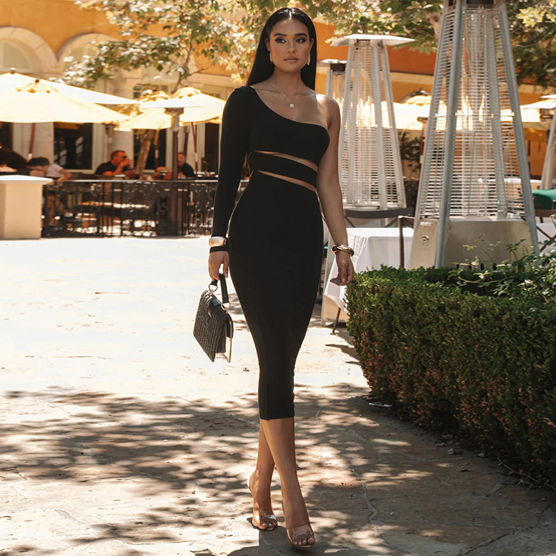 YL23488European and American Personalized Split One-Shoulder Dress 2023Autumn New Simple Sexy Cutout Hip Skirt